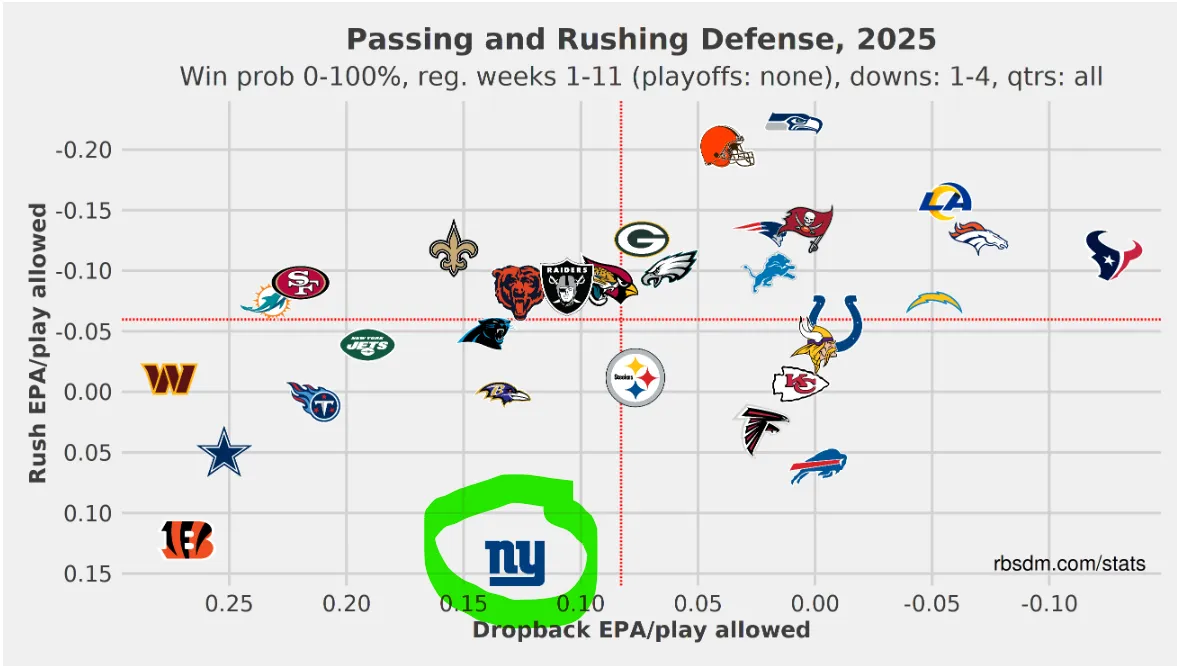 Dalo by sa argumentovať, že tento rok by mohol byť v Giants v lepšej ofenzívnej situácii a preto by mohol byť menej náchylný na straty. Tento argument však sotva obstojí — z Clevelandu, ktorý bol vlani 32. v DVOA, sa presunul do Giants, ktorí sú tento rok 24., pričom mierne zlepšenie zrejme spôsobilo najmä výkony Jaxsona Darta. Tento útok Giants nepatrí medzi produktívne — v EPA na jeden snap sú na 23. mieste a v ofenzívnom success rate na 26. mieste. Napriek tomu im Jaxson Dart v posledných týždňoch priniesol novú energiu, keď dali viac než 30 bodov proti Eagles aj Broncos v dvoch zápasoch po sebe. S Russellom Wilsonom síce New York zvládol dať 37 bodov proti deravej obrane Dallasu, ale proti Washingtonu skóroval len 6 bodov a proti Kansas City 9 bodov.