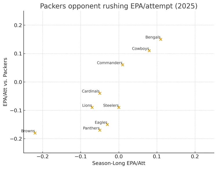Graf vyššie ukazuje sezónne EPA na jeden beh, ktoré povoľujú súperi Packers (os X), a EPA na jeden beh Packers proti týmto súperom v daných zápasoch (os Y). Ako vidno, Green Bay v podstate dosahuje presne to, čo sa očakáva podľa kvality behových obrán, proti ktorým nastupuje. V skutočnosti, v troch zápasoch proti tímom, ktoré v tejto sezóne povoľujú kladné EPA na beh (Bengals, Cowboys, Washington Commanders), dosiahli Packers priemerne 0.11 EPA na jeden beh. Pre porovnanie: lepšie sezónne číslo má len jediný behový útok v NFL: 8-2 Indianapolis Colts vedení potenciálnym MVP Jonathanom Taylorom. Naopak, v šiestich zápasoch proti obranám, ktoré majú v sezóne záporné EPA na beh (Lions, Browns, Cardinals, Steelers, Panthers, Eagles), dosiahli Packers priemer len –0.12 EPA na beh. Takýto výkon by celkovo v lige znamenal 29. miesto.