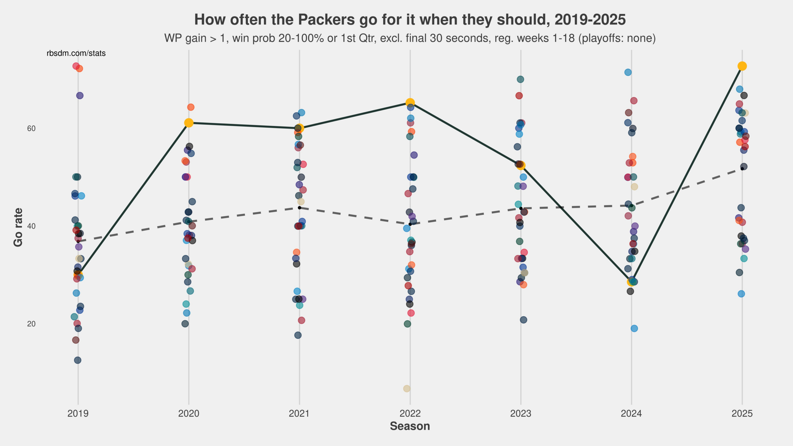 Keď sme si už prešli výsledky, poďme sa teraz pozrieť na LaFleurov proces, konkrétne na niektoré oblasti riadenia zápasu. Začnime jeho rozhodovaním na štvrtých downoch, za ktoré si podľa mňa zaslúži viacej kreditu, než dostáva. Odkedy sa v roku 2019 stal hlavným trénerom Packers, bol nad ligovým priemerom v prijímaní optimálnych rozhodnutí na štvrtých downoch (podľa RBSDM.com) vo všetkých sezónach okrem dvoch: